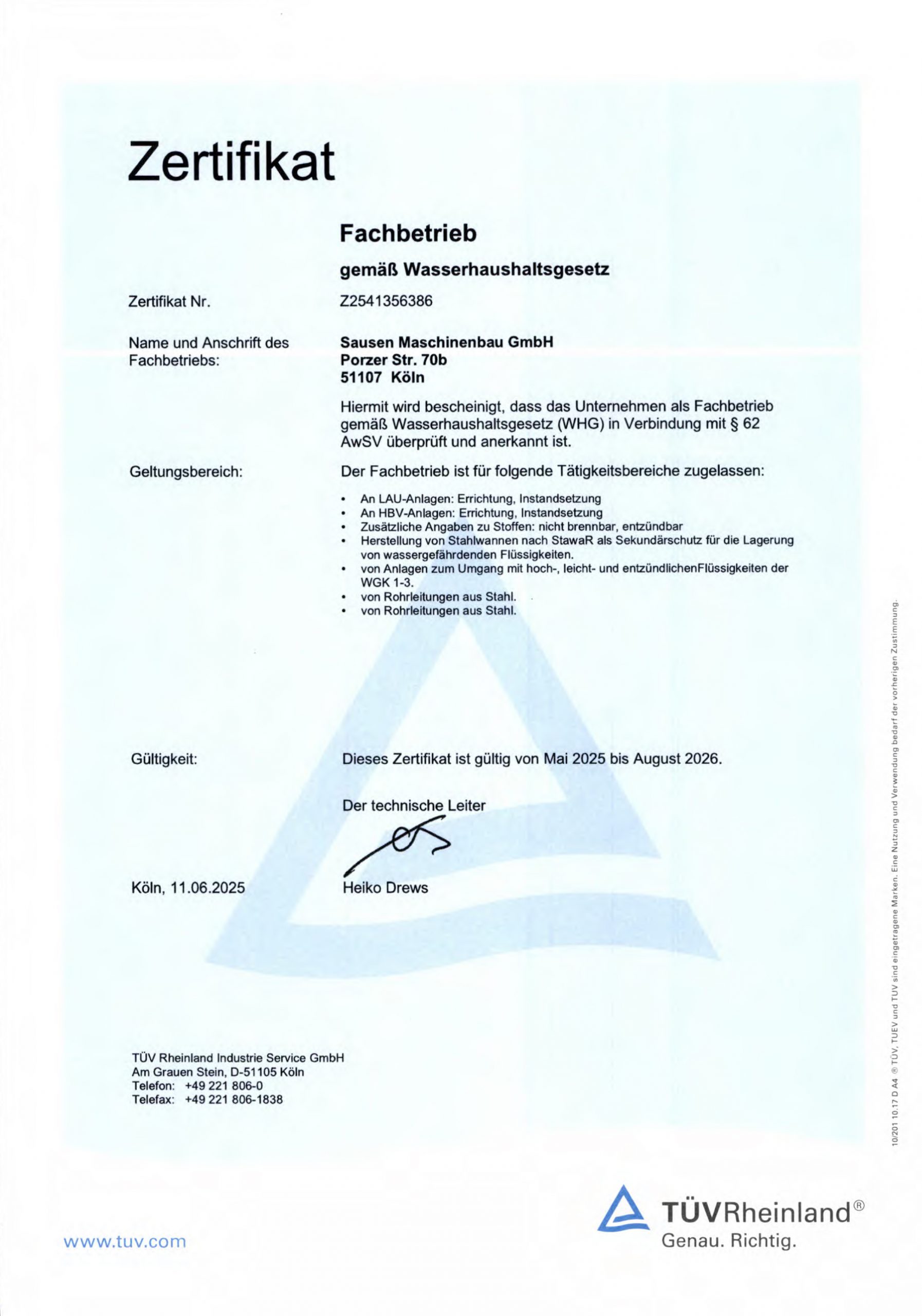 Als inhabergeführtes Unternehmen steht Sausen Maschinenbau heute für persönliche Beratung und zertifizierte Qualität. Als Fachbetrieb nach WHG (§62 AwSV) und mit zertifizierten Schweißfachkräften für 1.4404 und 1.4435 gewährleisten wir zuverlässige und normgerechte Fertigungsprozesse – von der ersten Konstruktion bis zur finalen Umsetzung.